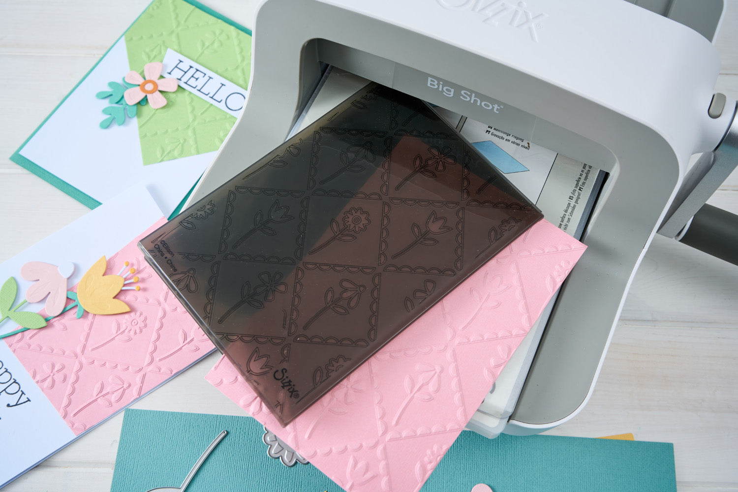 The Scallop Framed Florals Embossing Folder by Catherine Pooler is designed for use with Sizzix Big Shot and lets you add layered, dimensional floral designs to cardstock.