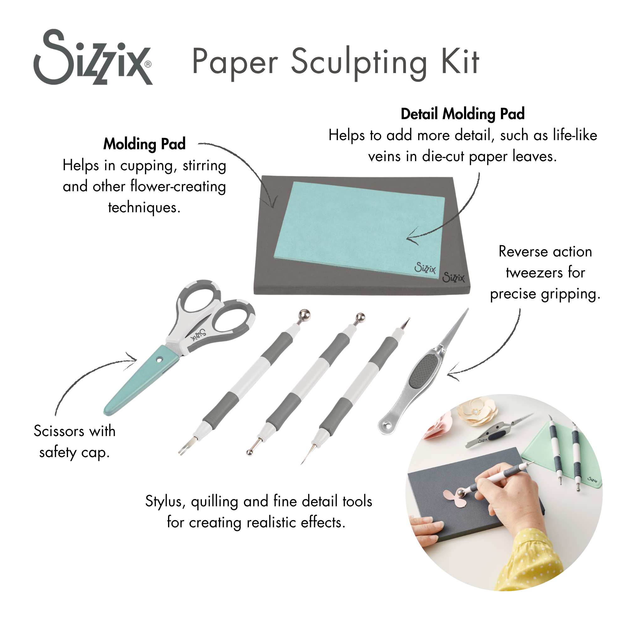 Want to make realistic-looking flowers? The Sizzix Paper Sculpting Kit features seven versatile tools to add realism to Sizzix flower shapes and other projects. The Molding Pad helps in cupping, shaping, stirring and other flower-creating techniques. The Detail Molding Pad creates lifelike veins in the paper leaves. This kit can be used with our making essentials, these include cardstock, textured roll, crepe paper and foam. Add dimension and definition to your paper flowers with the Fine Detail Tool, Reverse-Action Tweezers, Quilling Tool, Small Scissors and Stylus tools.